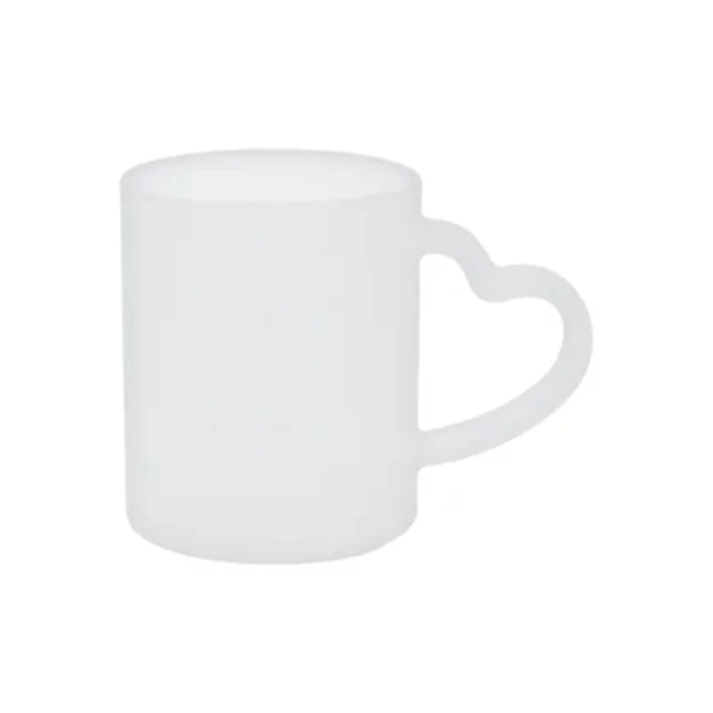 Surpreenda seus clientes com a caneca de vidro jateado com alça em formato de coração, uma excelente opção para presentes personalizados, ocasiões especiais e brindes com temática romântica. O acabamento fosco translúcido valoriza as artes sublimadas, conferindo um visual refinado e moderno. O grande diferencial está na alça em formato de coração, que acrescenta delicadeza e originalidade ao produto. Compatível com prensa cilíndrica para sublimação, a caneca garante transferências de alta qualidade, com ótima nitidez e reprodução fiel das cores.